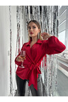 Kadın Kruvaze Polo Yaka İpek Saten Bluz  Kırmızı